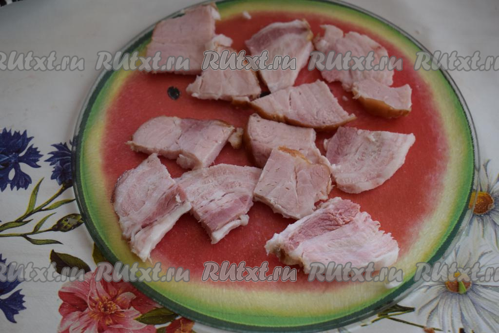 Грудинку (или колбасу) нарезаем на треугольнички.