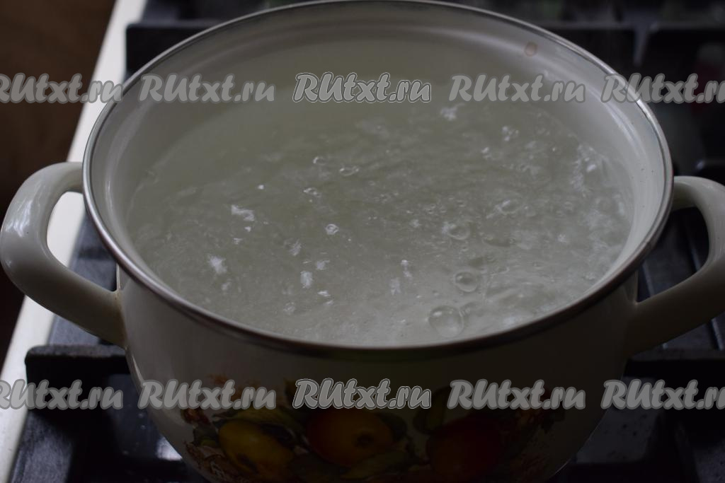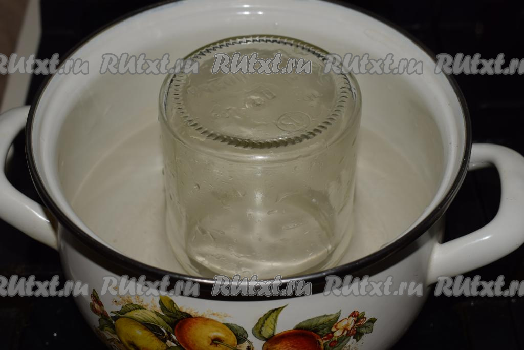 В это же время банки стерилизуем кипятком, для этого в кастрюлю небольшого объема наливаем воду, ставим банку на горлышко, включаем средний огонь и ждем, пока вода нагреется до горячего состояния.