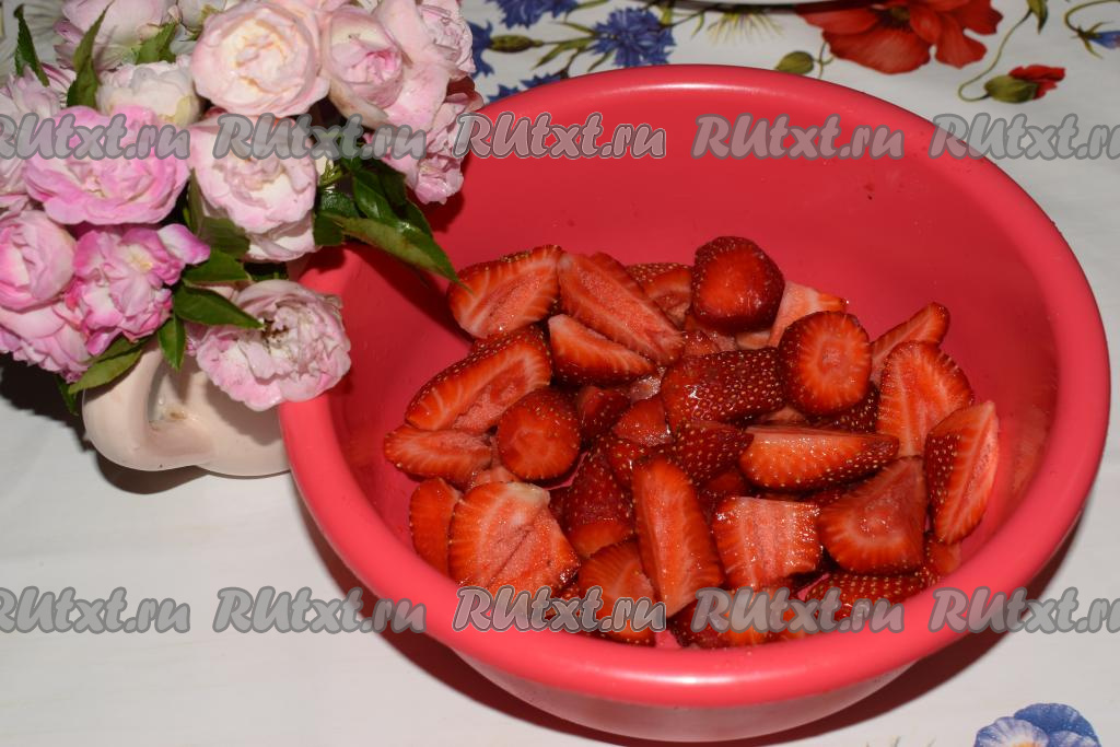 Перебираем клубнику, оставляя только крепкие и целые ягоды (без мятых боков и следов порчи), удаляем чашелистики. Если ягоды крупные - разрезаем пополам, мелкую клубнику оставляем целой.