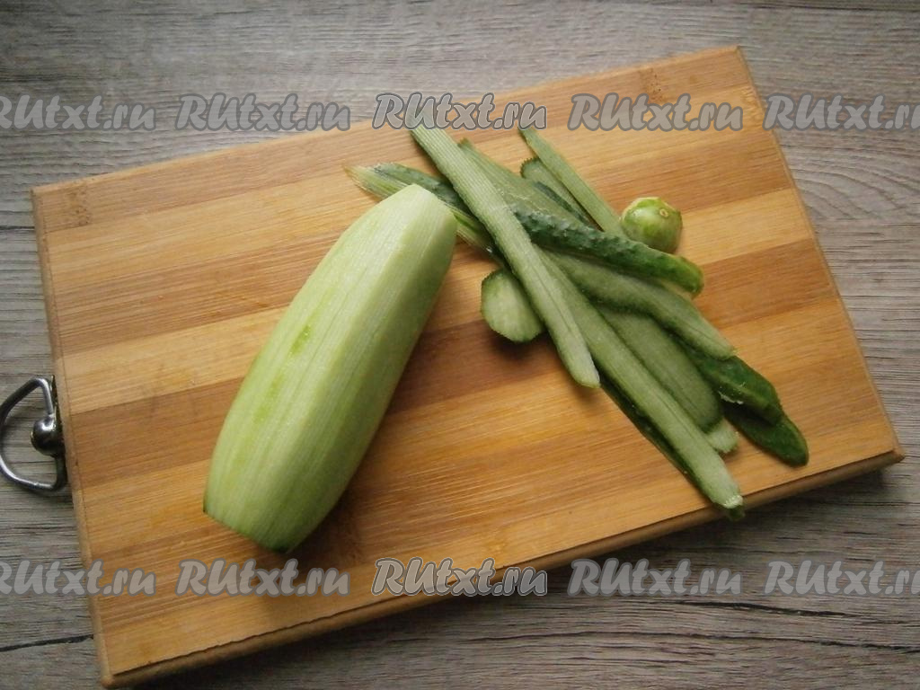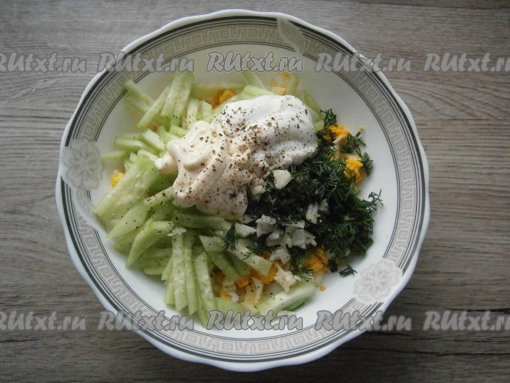Огурец нарезать соломкой или брусочками и добавить к яйцам вместе с измельченным укропом.