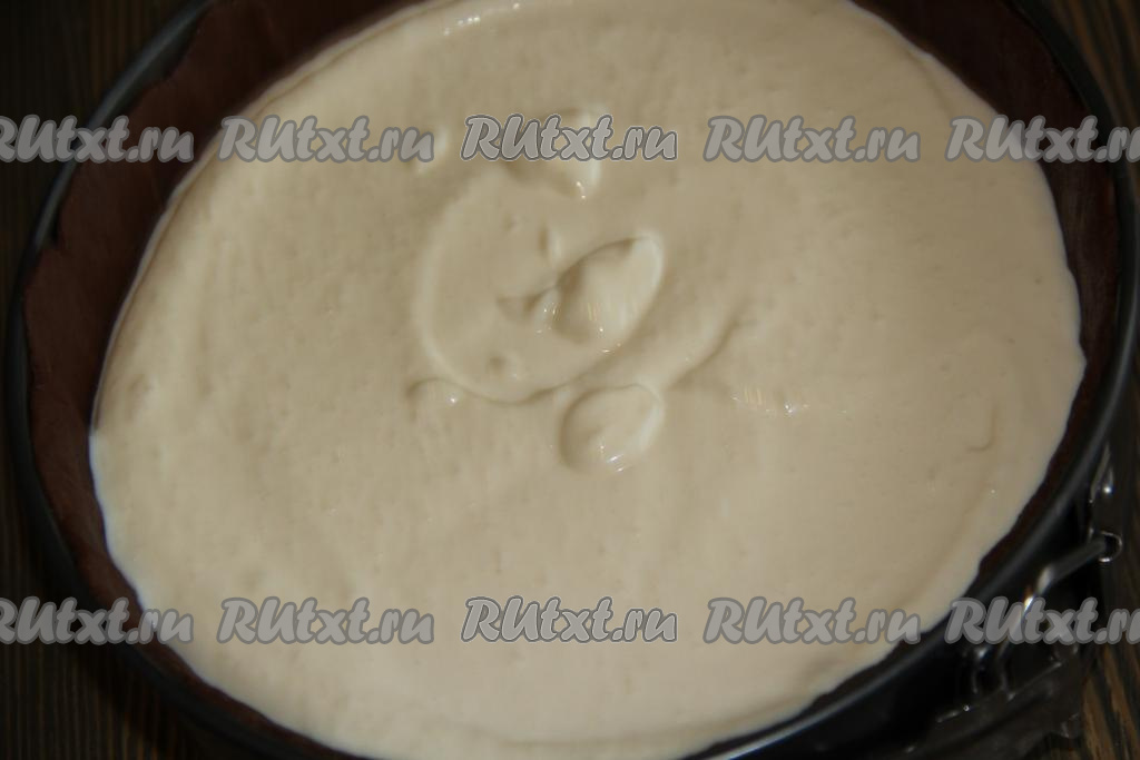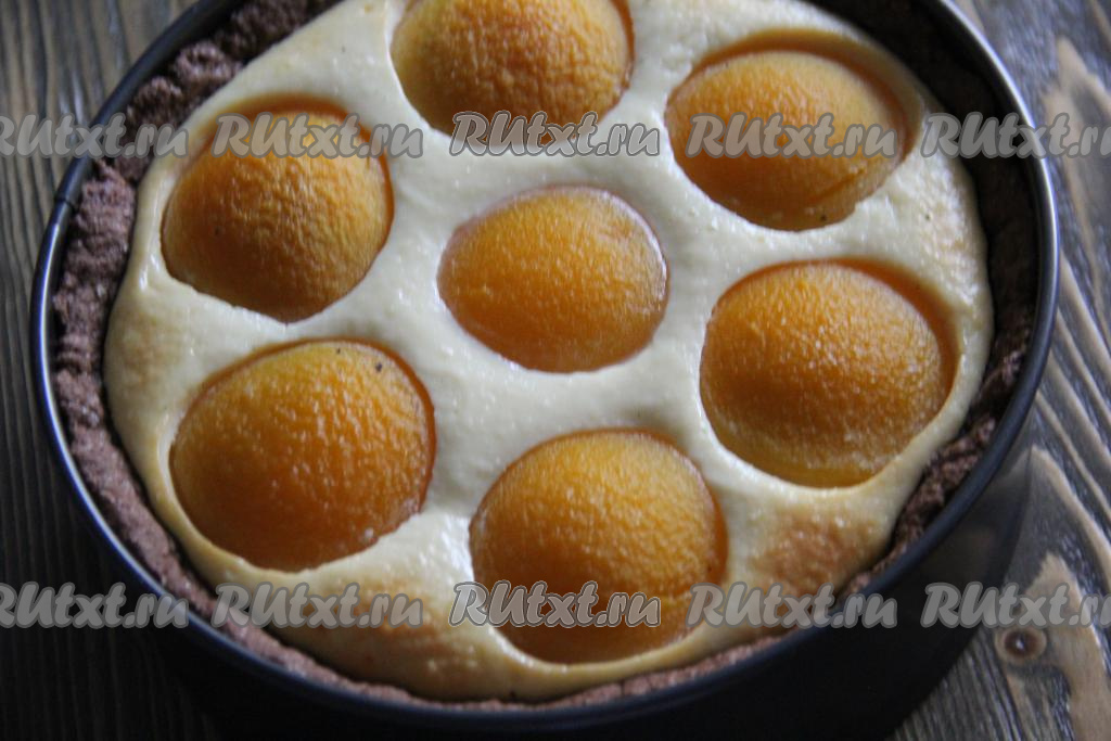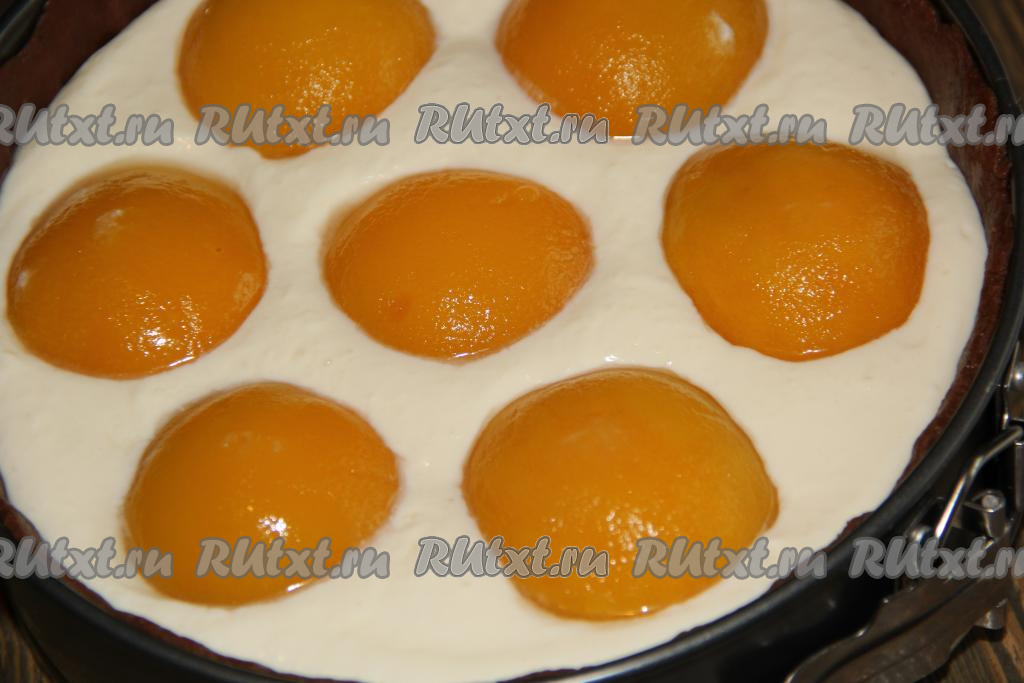 Поверх начинки выложить дольки персиков и слегка их утопить в начинку.