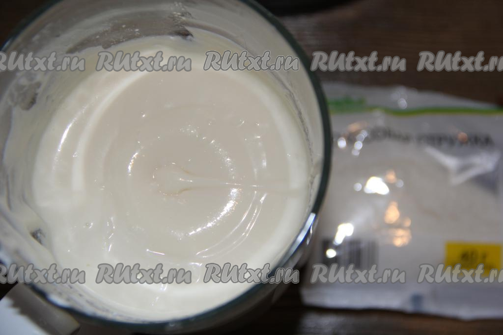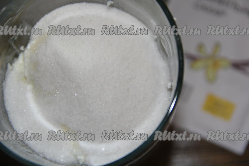Для приготовления начинки нужно поместить творог в чашу блендера, добавить сахар и ванильный сахар.