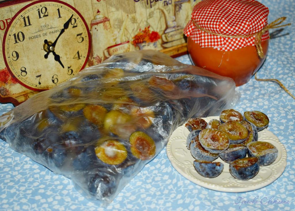 Кладем подготовленные сливы в пакетах в морозилку и замораживаем. Замороженные сливы прекрасно хранятся около года. Для их использования надо достать пакет с плодами и слегка ударить об стол, для того чтобы сливы разъединились и мы смогли взять столько, сколько нам нужно, а остальные убрать в морозилку до следующего раза. Далее можно использовать половинки слив по назначению, не размораживая. Вот так просто и быстро можно заморозить сливы на зиму. Отличная заготовка, попробуйте!