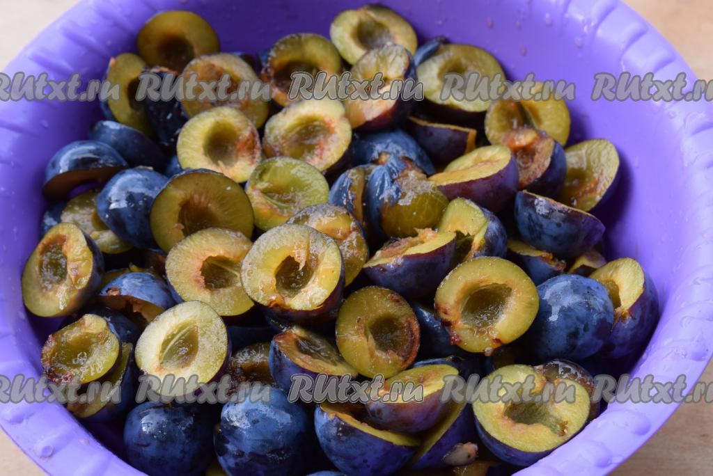 Перебираем сливы, промываем их под холодной проточной водой. Удаляем косточки из слив, разрезая их на половинки.