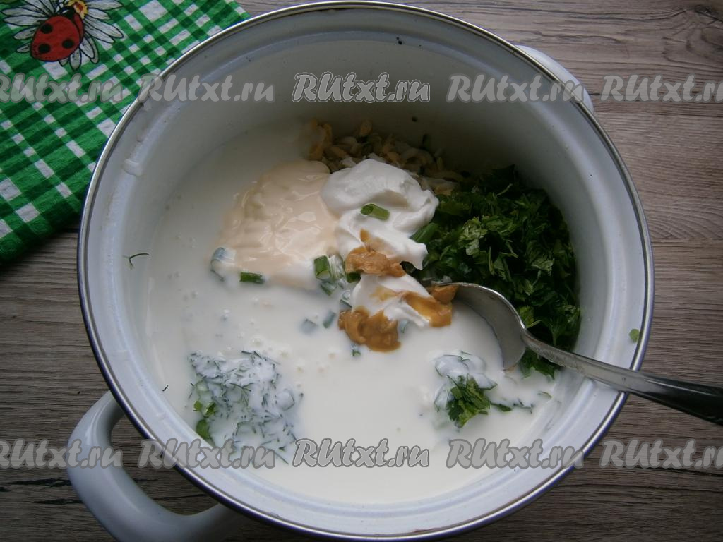 Разбавить блюдо сывороткой до нужной вам густоты. Окрошку посолить, всыпать немного сахара, перемешать и охладить.