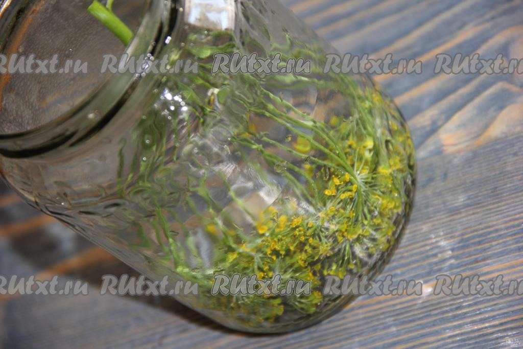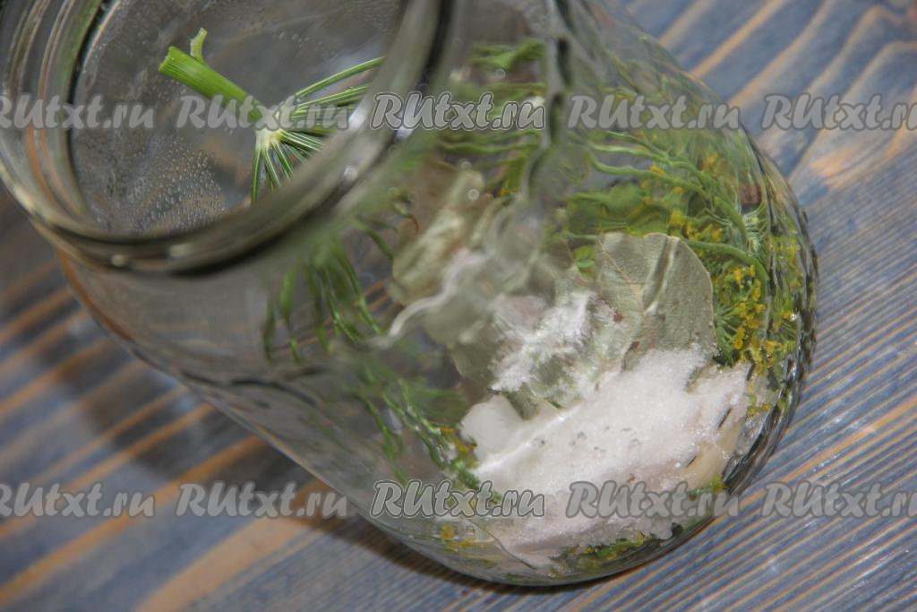 Банку хорошо вымыть и простерилизовать любым удобным для вас способом. В подготовленную баночку выложить зонтик укропа, лавровый лист, горошины чёрного и душистого перцев, очищенные зубчики чеснока.