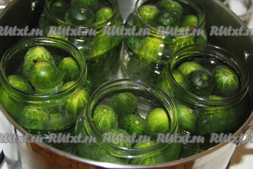 На дно кастрюли поместить кухонное полотенце. Банки поставить в кастрюлю на полотенце и налить тёплую воду так, чтобы банки оказались в воде больше чем на половину. Полотенце на дне кастрюли необходимо для того, чтобы банки не треснули. Банки прикрыть крышками. Поставить кастрюлю с банками на огонь, стерилизовать банки с огурцами в течение 8 минут с момента закипания воды на среднем огне.