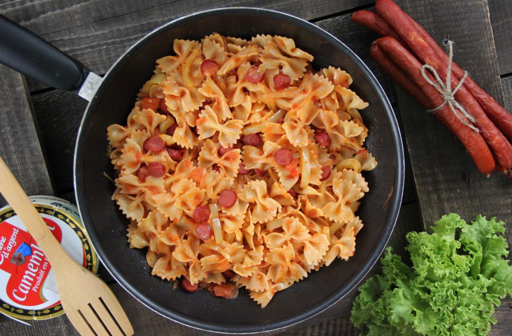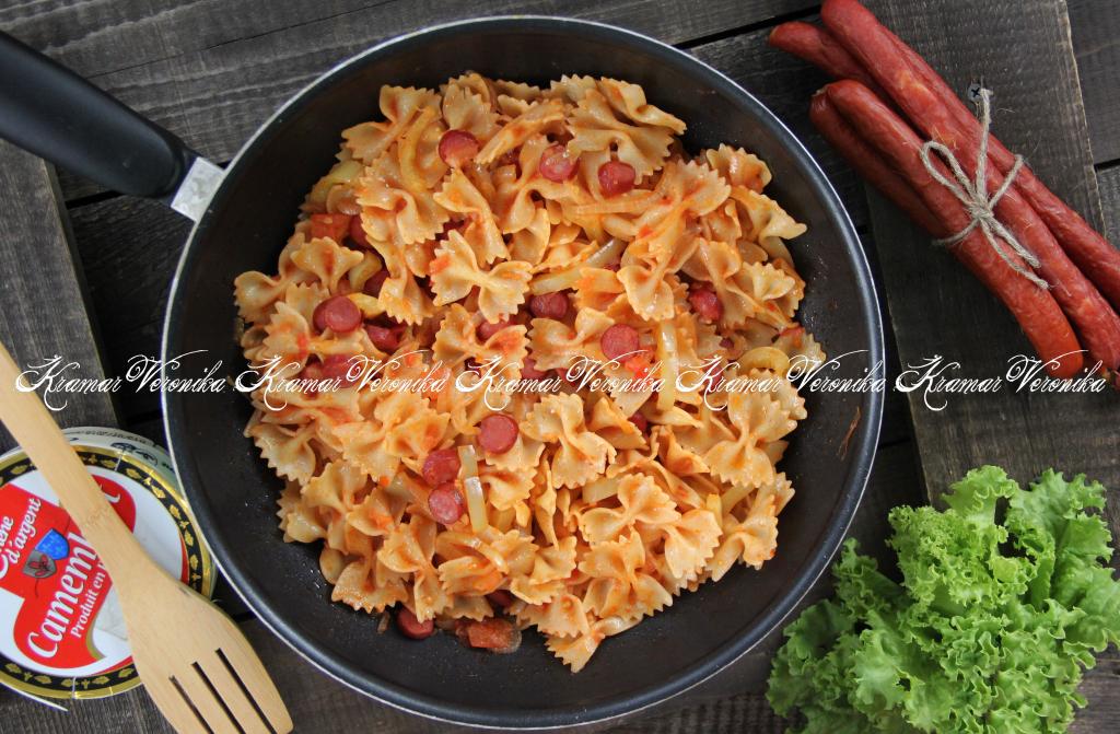 Хорошо перемешать макароны с колбасой и овощами, прогреть пару минут на небольшом огне и снять с огня.