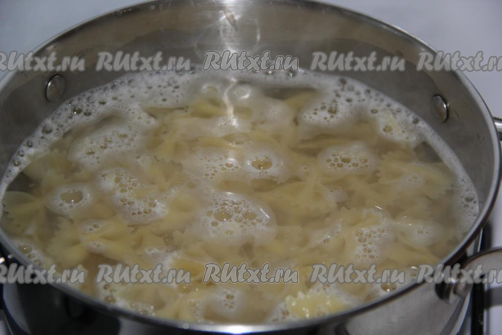 Макароны для этого блюда можно брать любой формы. Макаронные изделия выложить в кипящую подсоленную воду и отварить до готовности в соответствии с инструкцией на упаковке, затем, откинув на дуршлаг, промыть холодной водой.
