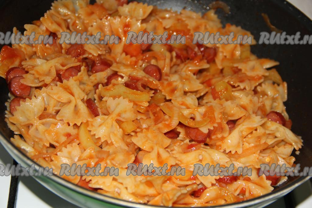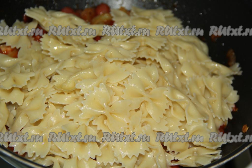 Добавить макароны в сковороду.