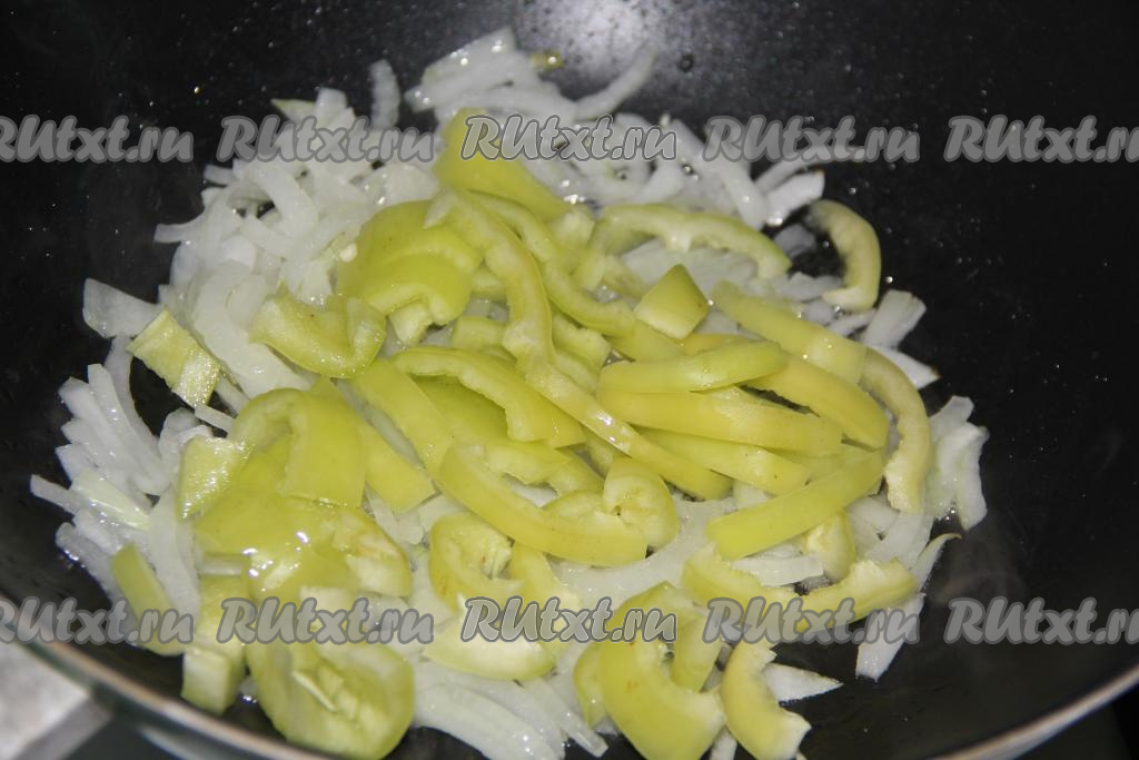 Болгарский перец, удалив из него семена, нарезать тонкими полосками, выложить на сковороду с луком и обжаривать на среднем огне минут 5, иногда перемешивая.