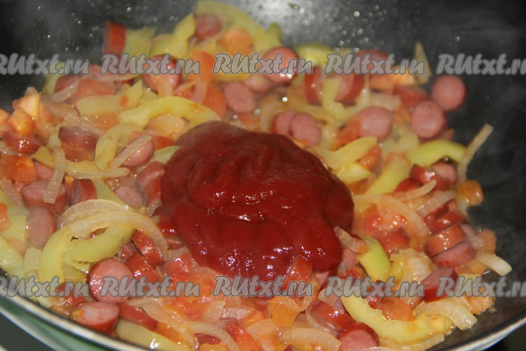 Затем добавить томатную пасту (или кетчуп), перемешать и потомить 2-3 минуты.