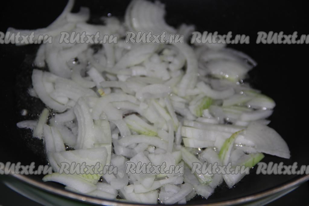 Очищенный лук, нарезав тонкими полукольцами, выложить в сковороду (я готовила в сковороде вок), разогретую с растительным маслом, и обжарить, помешивая, до золотистого цвета.