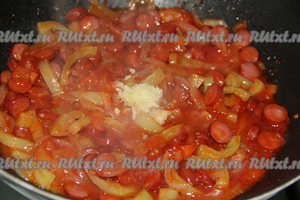 Очищенный чеснок, пропущенный через пресс, выложить на сковороду с овощами и колбасой, добавить соль и специи по вкусу, хорошо перемешать.
