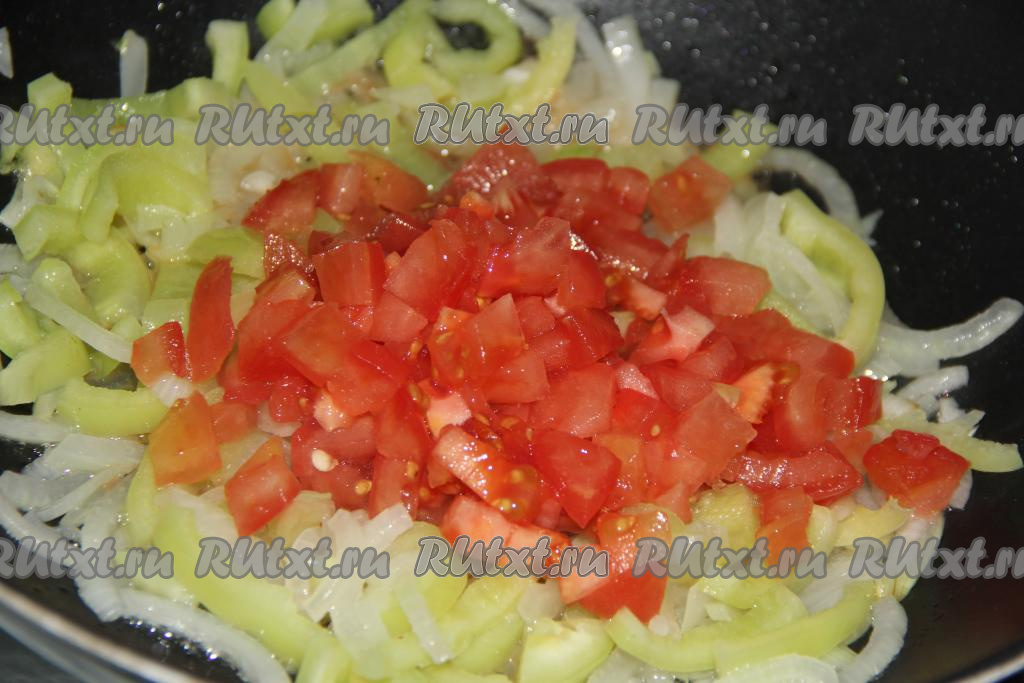 Помидор, очищенный от шкурки, мелко нарезать, выложить в сковороду с овощами, перемешать и потушить минут 5-7 на небольшом огне.