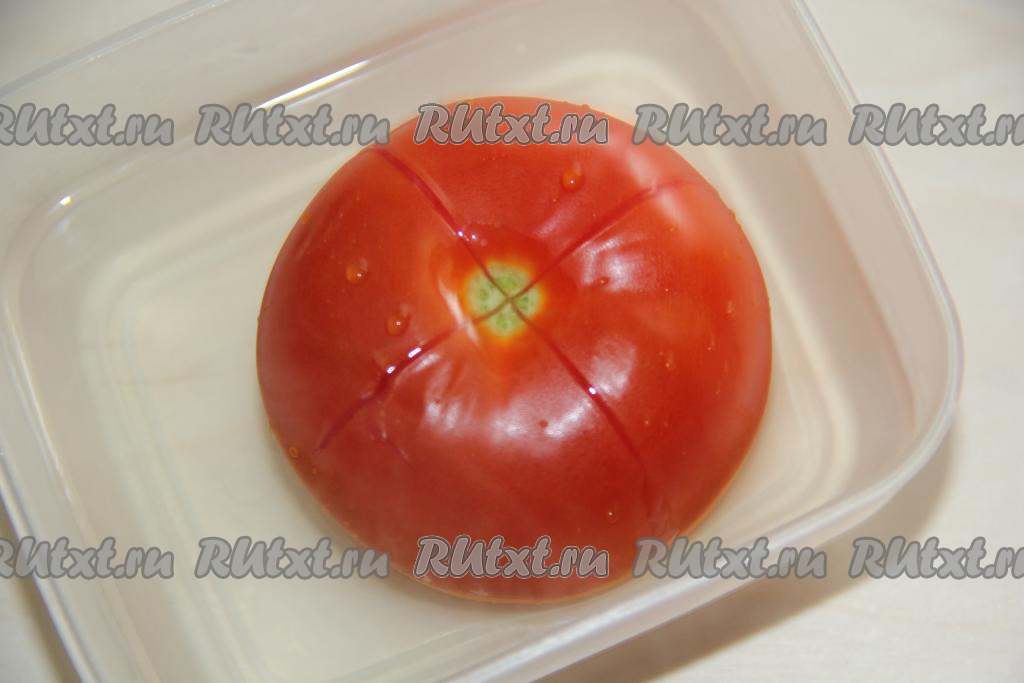 Помидор вымыть. На помидорчике сделать крестовой надрез, ошпарить кипятком и снять шкурку (благодаря кипятку шкурка отделится достаточно легко).