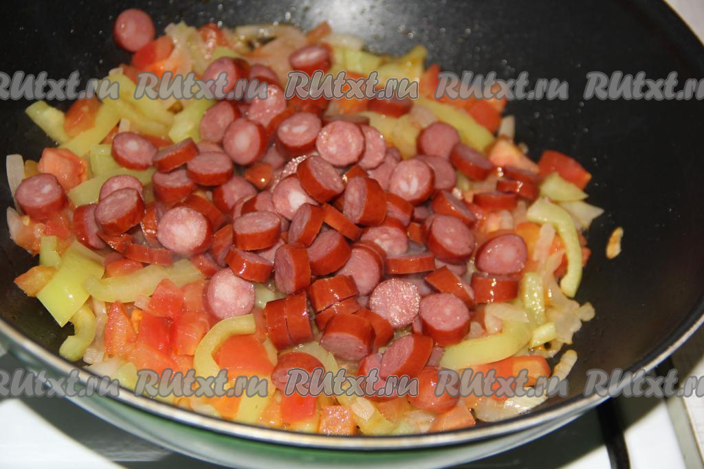 Колбасу нарезать на кусочки среднего размера, добавить в сковороду к овощам, хорошо перемешать и обжарить в течение минут 5, периодически помешивая.