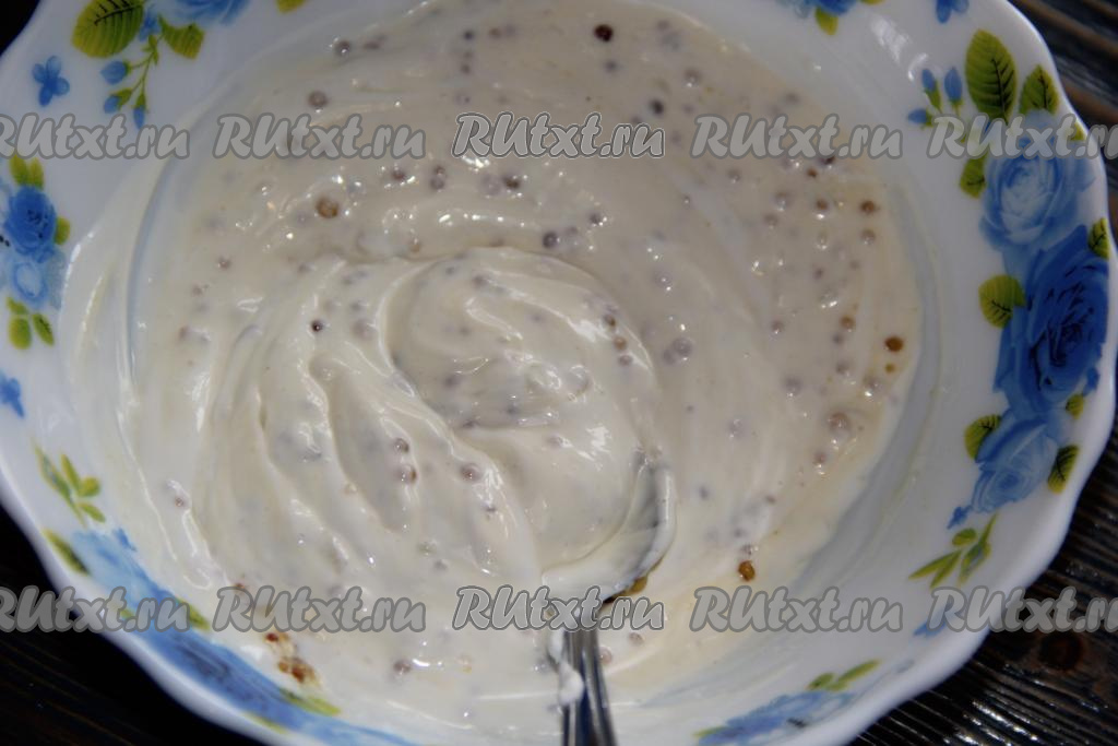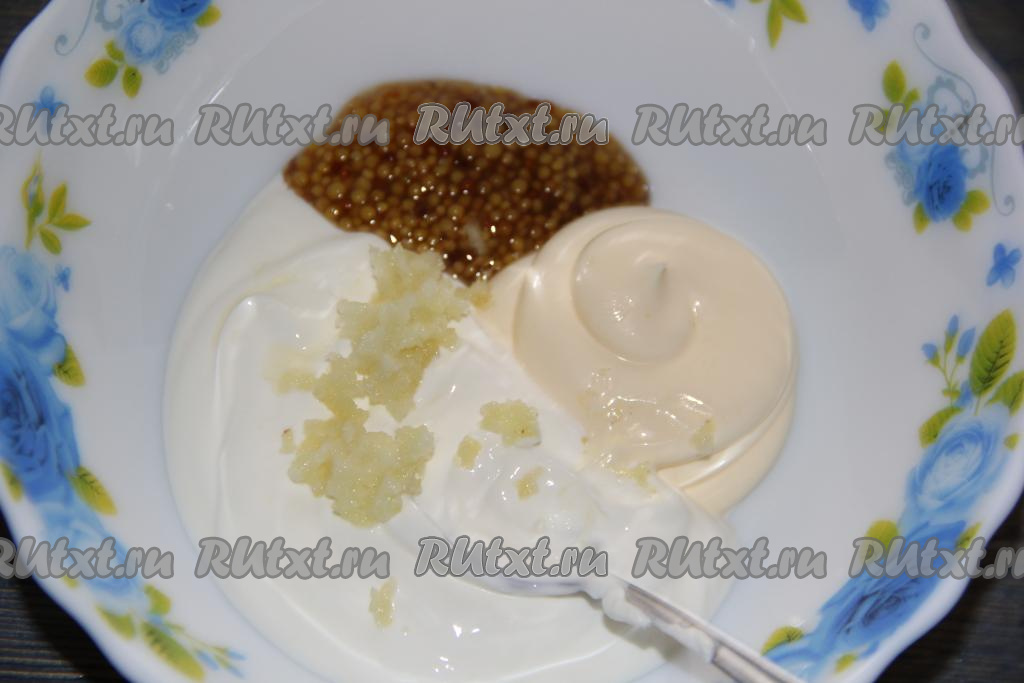 Чеснок очистить и пропустить через пресс. Для приготовления заправки соединить майонез, сметану, чеснок и зерновую горчицу.