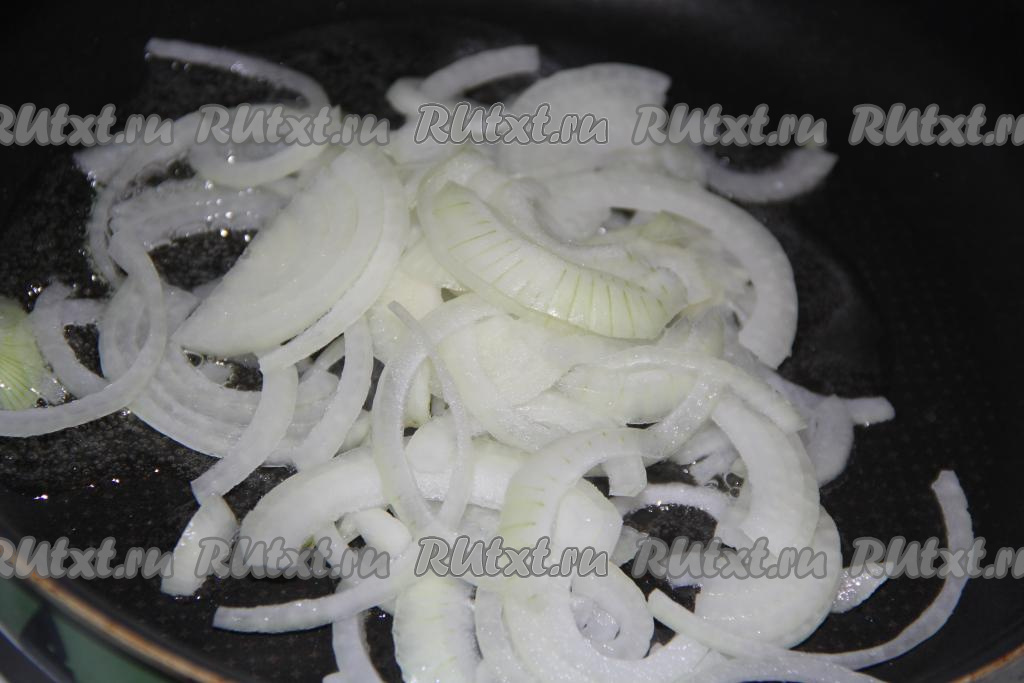 Лук очистить, нарезать тонкими полукольцами. На сковороду влить немного растительного масла, выложить лук и обжарить, помешивая, до золотистого цвета.