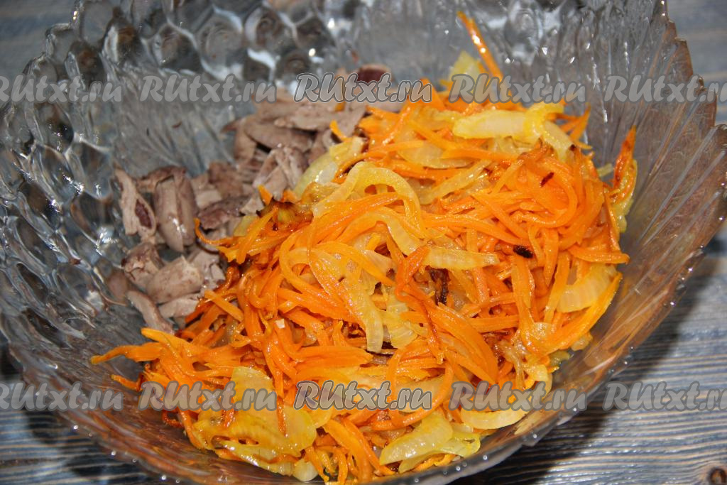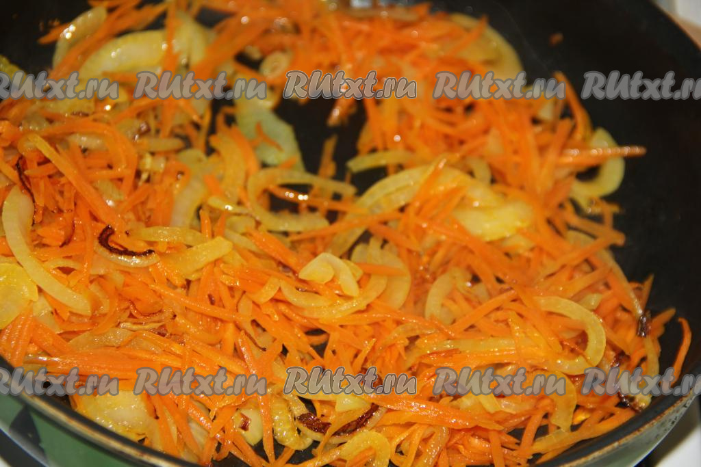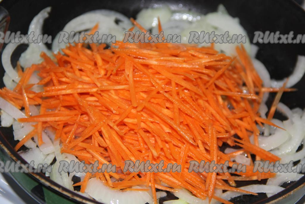 Очищенную морковь, натертую на крупной тёрке (или на тёрке для моркови по-корейски), выложить на сковороду к обжаренному луку.