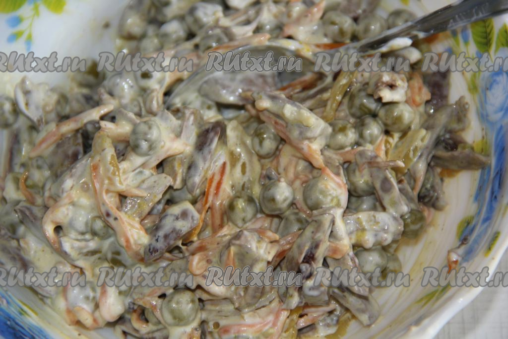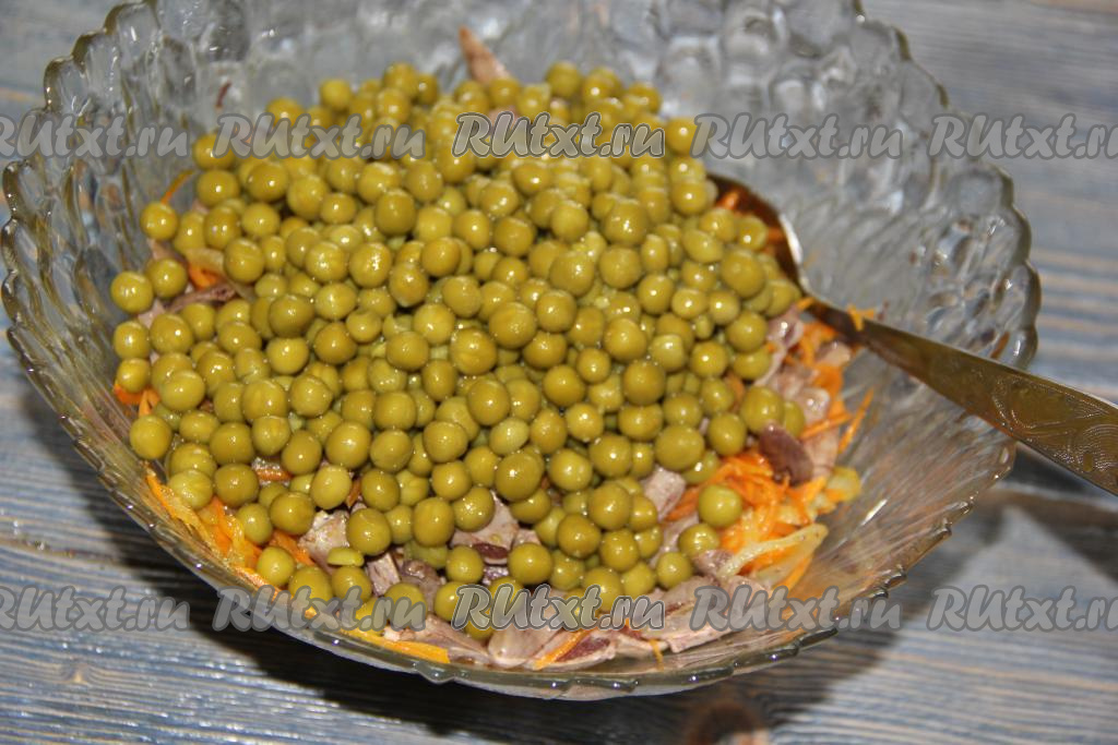 С горошка слить жидкость и добавить в салат из куриных сердечек, моркови и лука.