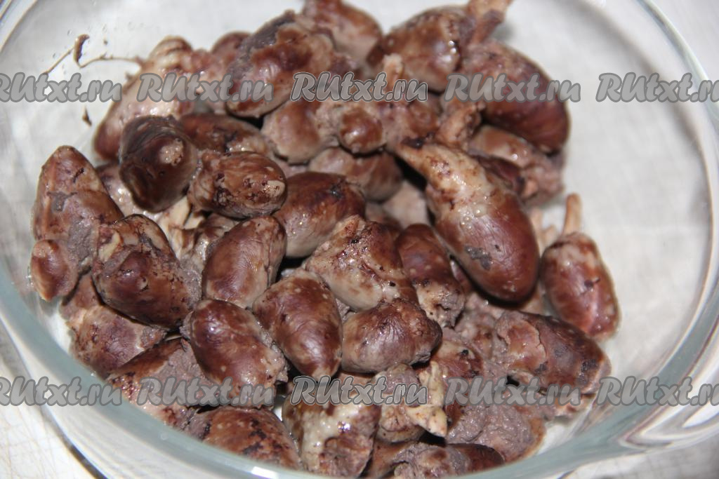 Куриные сердечки промыть под проточной водой, выложить в кастрюлю, залить холодной водой. Поставить кастрюлю на огонь и варить сердечки, примерно, 25 минут. Бульон в дальнейшем можно использовать для приготовления супа. Вареные сердечки остудить.