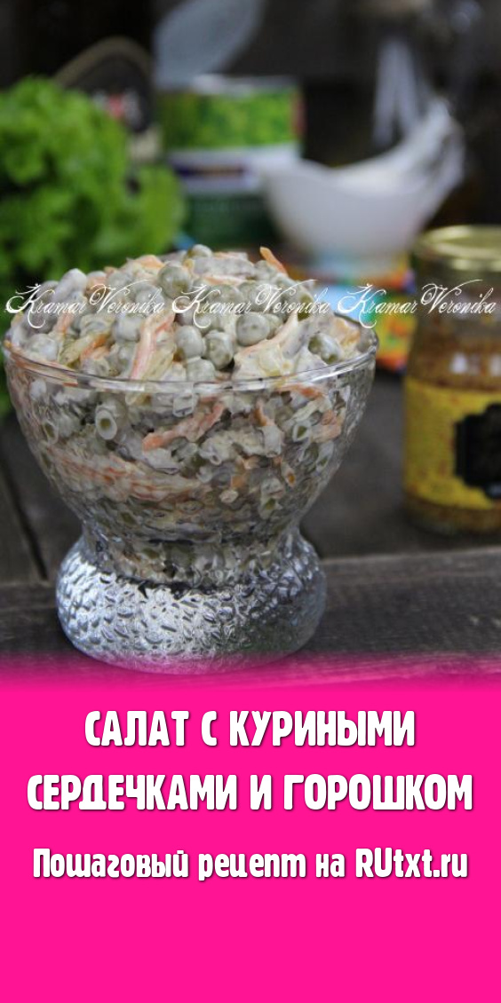 Хочу предложить рецепт салата с куриными сердечками и горошком. Блюдо получается сытным и вкусным, оно станет хорошей альтернативой мясному салатику. Подать его можно и на праздничный, и на повседневный стол. Попробуйте, этот салат отлично разнообразит меню и порадует прекрасным вкусом.