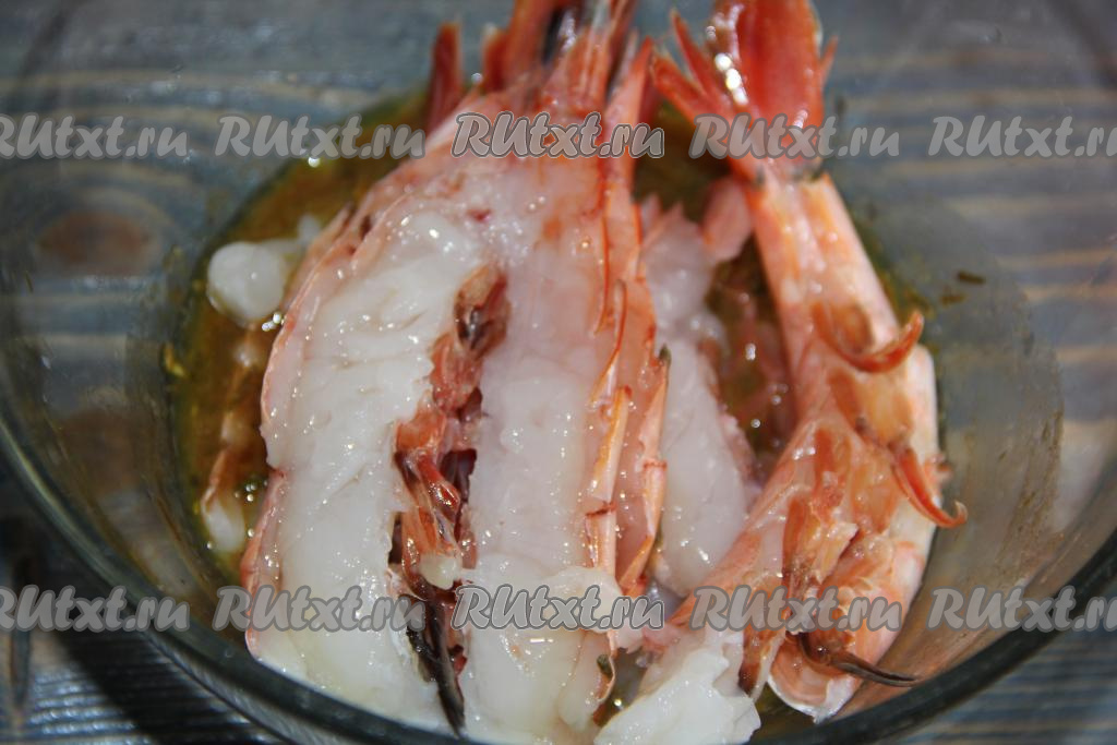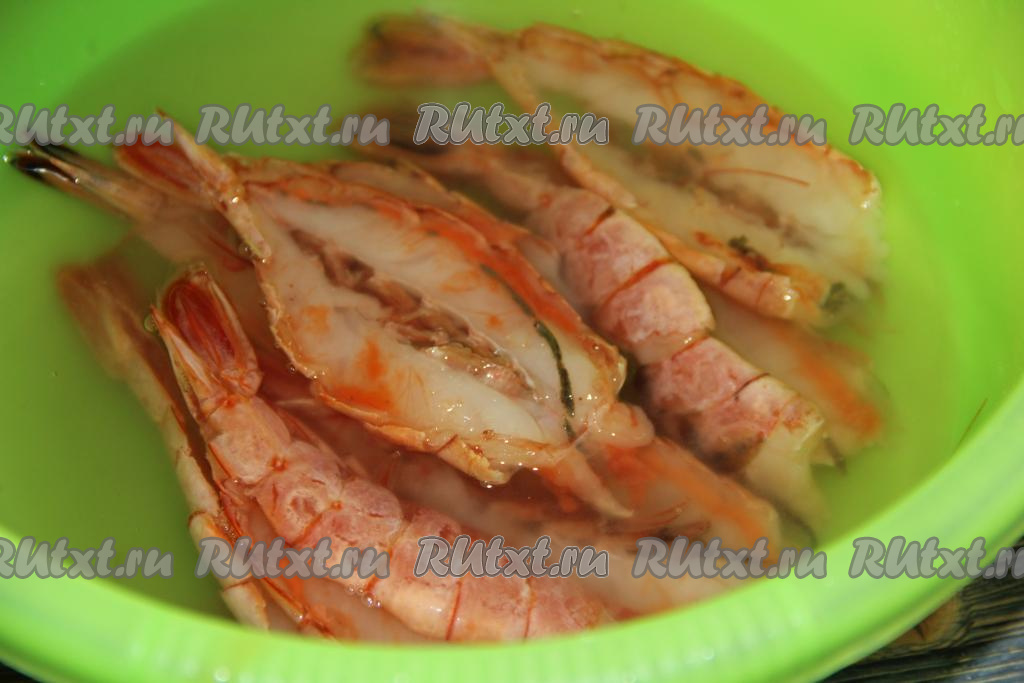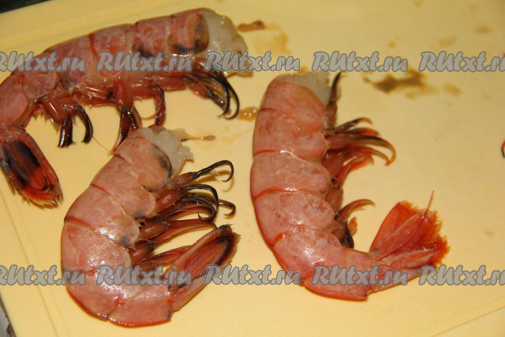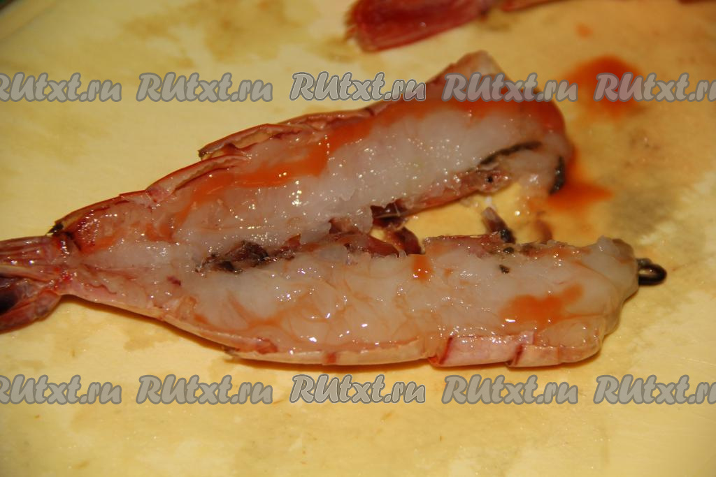 Острым ножом разрезать каждый лангустин в длину, не разрезая до конца (как на фото). Хвостик будет держать обе части. Панцирь снимать не нужно.