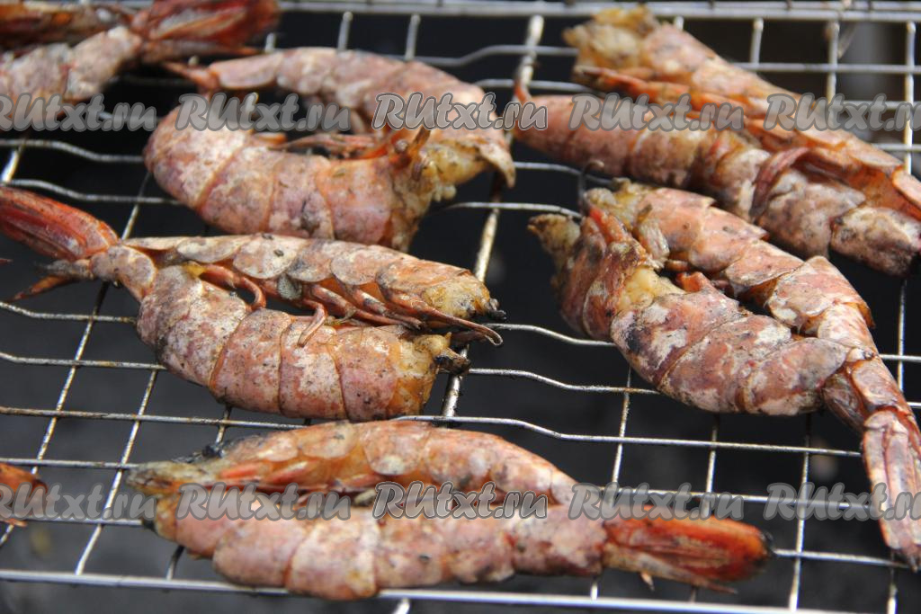 Положить решётку на мангал, жарить лангустины по 2 минуты с каждой стороны.