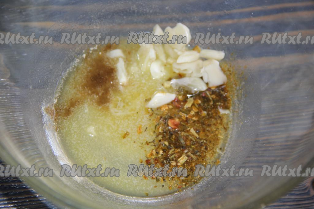 Для приготовления маринада соединить растопленное не горячее сливочное масло, специи для рыбы, чёрный молотый перец и очищенный чеснок, нарезанный на тонкие пластины.