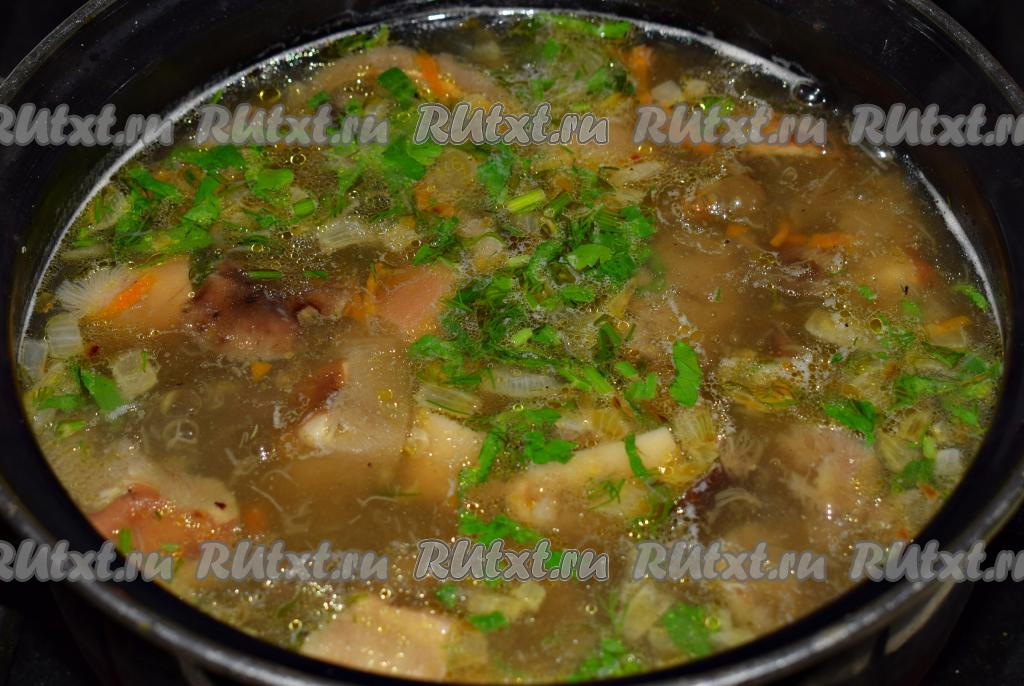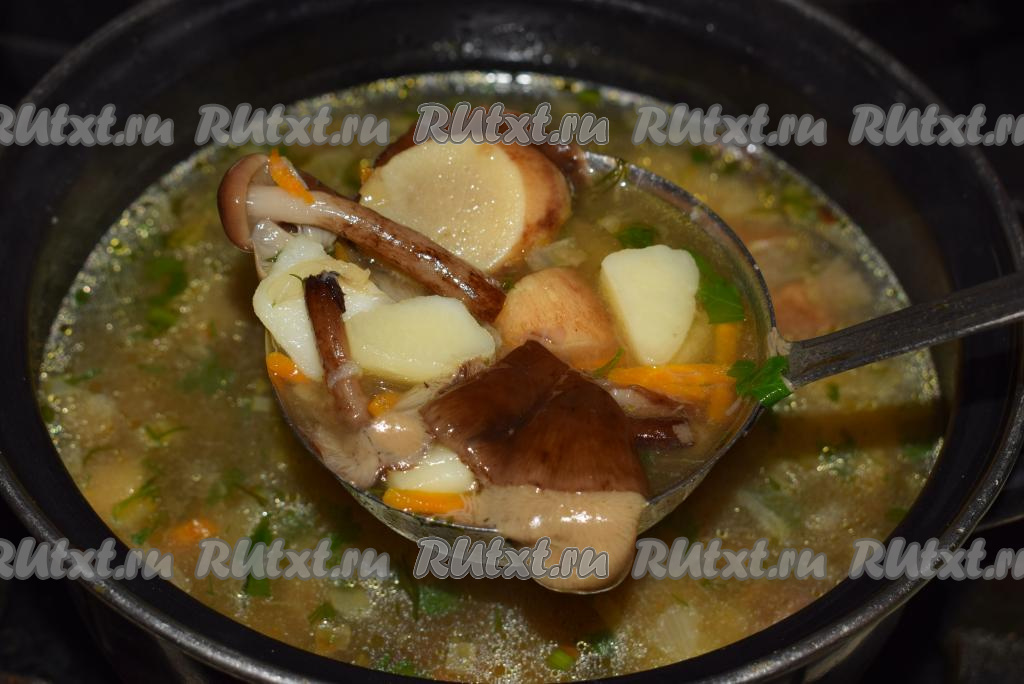 В готовый грибной суп добавляем мелко нарезанную зелень и выключаем огонь. Даем настояться супу, прикрыв его крышкой, около 10 минут.