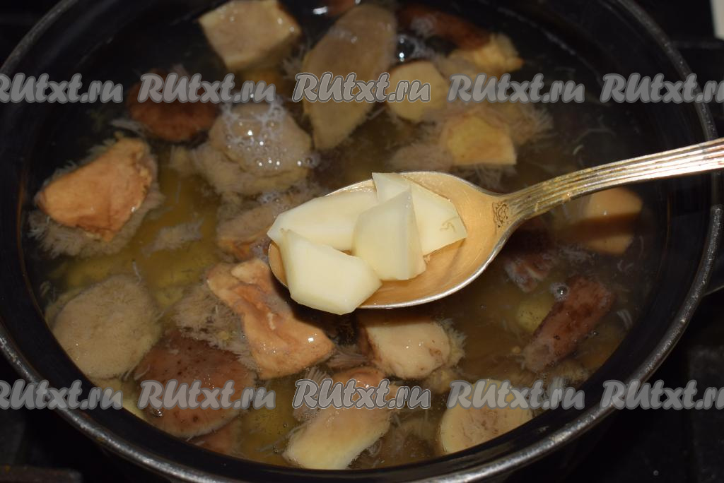 В кастрюлю с грибами кладем картофель, солим, перчим суп и варим его до готовности картошки (примерно, 15-20 минут).