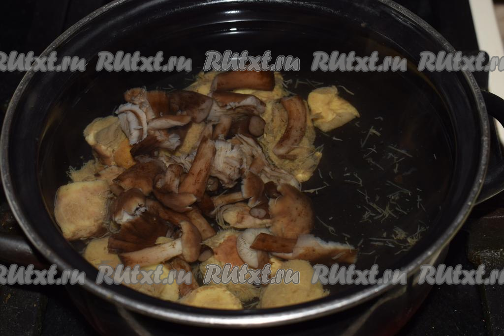 В кастрюлю для супа наливаем 2 литра чистой холодной воды и даем ей закипеть. Добавляем отваренные грибы и варим их с момента закипания 10 минут на небольшом огне.