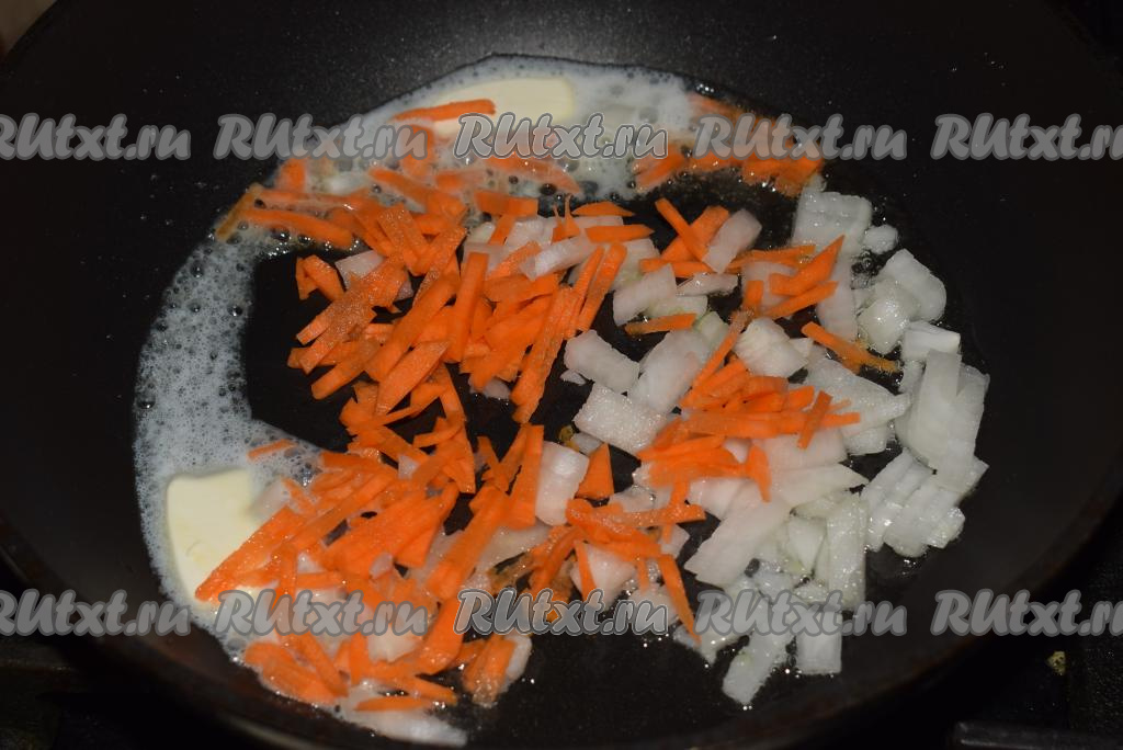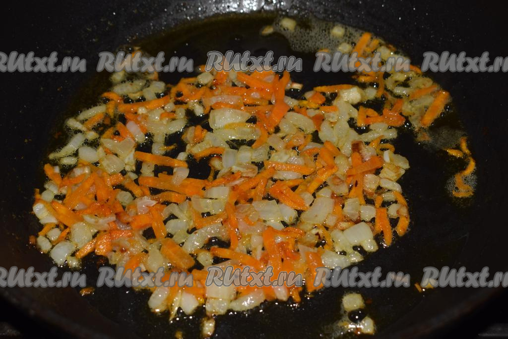 Жарим морковку с луком, иногда помешивая, на медленном огне до прозрачности овощей (примерно, 12 минут).