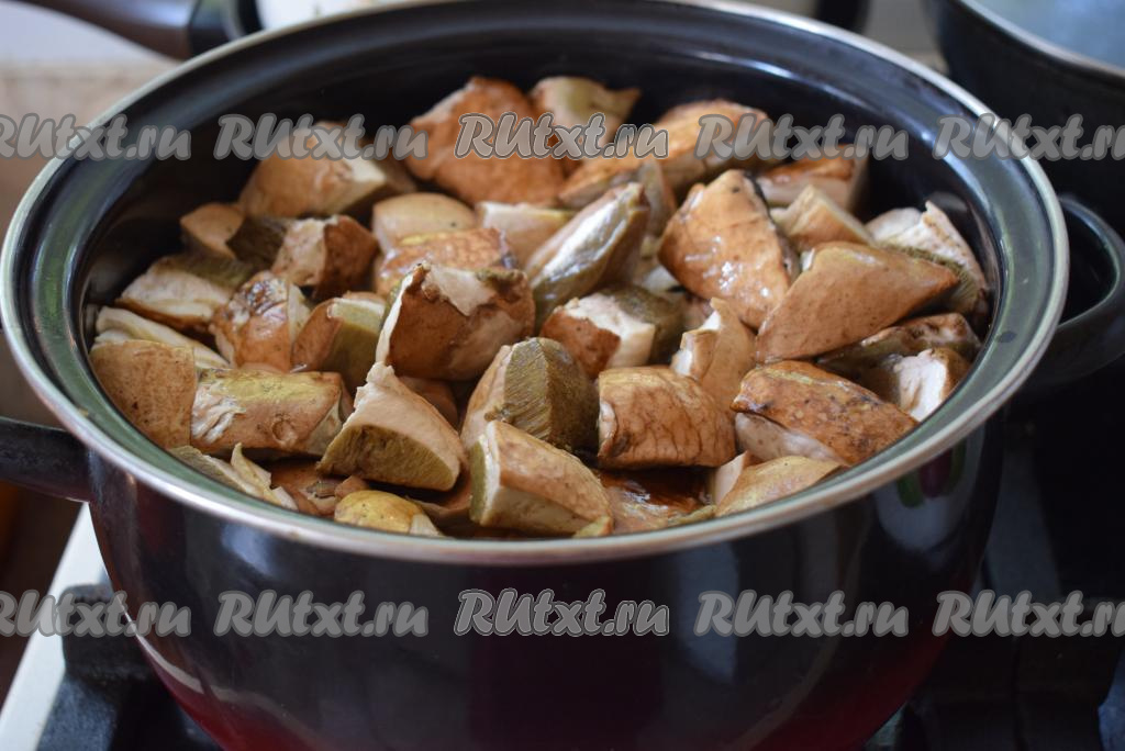 Нарезанные грибы отвариваем в подсоленной воде в течение 30 минут с момента закипания на небольшом огне. Затем откидываем грибы на дуршлаг и даём стечь жидкости. Некоторые кулинары рекомендуют варить суп из лесных грибов на бульоне, в котором они отваривались, но я всегда предпочитаю слить эту жидкость, так как в грибах могут попасться насекомые или мелкий, не различимый в процессе промывки мусор.