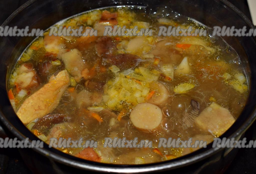 Когда картофель будет готов, добавляем в суп из лесных грибов обжаренные лук и морковь, провариваем суп около 5 минут с момента закипания.