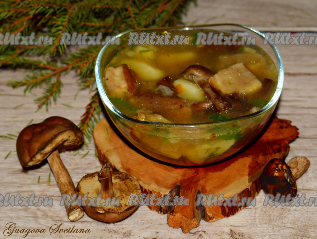 Осенняя пора богата дарами природы. Белые грибы, маховики, подосиновики, опята и множество других грибов дарит нам осень. Из свежих лесных грибов можно приготовить немало вкусных и ароматных блюд. Я предлагаю сварить великолепный, насыщенный, ароматный грибной суп. Для этого блюда я взяла белые грибы и опята в равных пропорциях, а вы можете взять другие виды лесных грибов. Вкус у супа получается просто волшебным. Прозрачный грибной бульон, ароматные грибочки, картошка и зажарка, вроде все просто, но как вкусно! И, кстати, такой супчик можно приготовить не только из свежесобранных грибов, но и из замороженных.