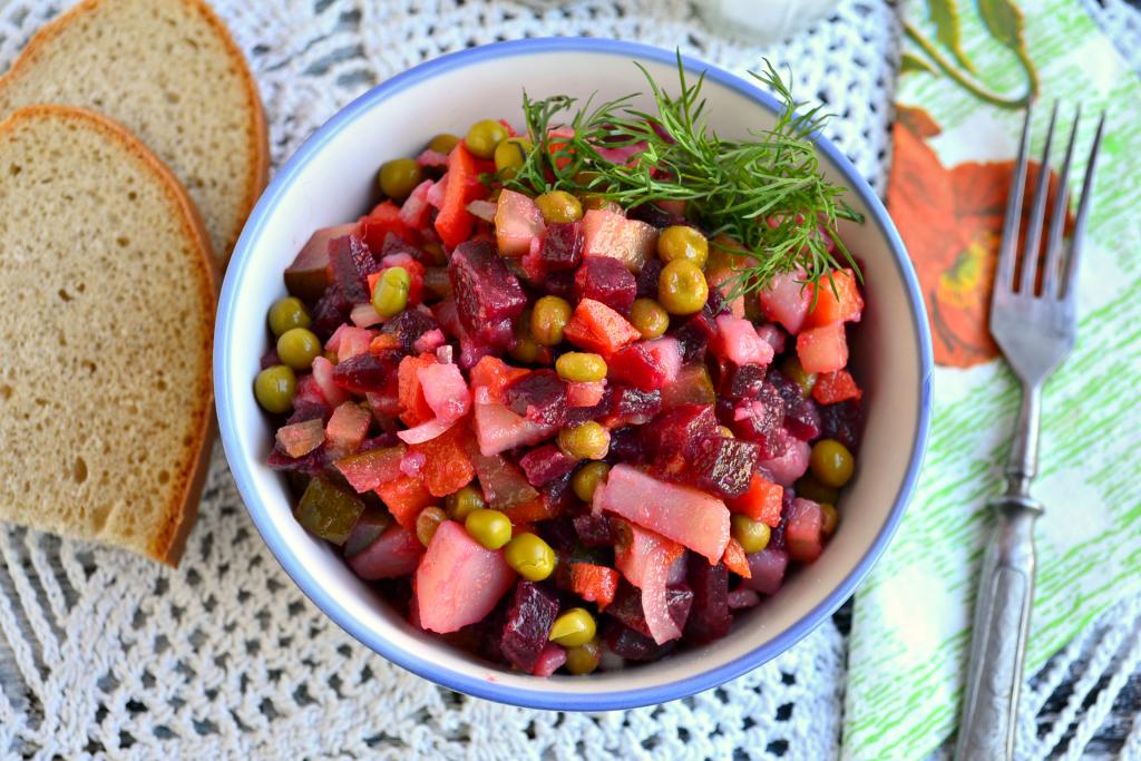 Предлагаю вам самый любимый в моей семье рецепт винегрета с солеными огурцами и горошком. Салат получается очень вкусным, его любят все без исключения. Масло для заправки винегрета лучше использовать базарное душистое, нерафинированное, тогда и салат получится необычайно ароматным. Огурцы можете взять и соленые, и маринованные.