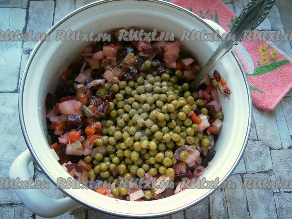 Влить заправку в винегрет, добавить консервированный горошек и соль.