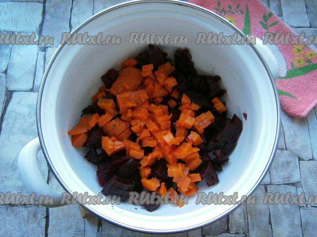 Свеклу, морковь и картофель предварительное отварить (вареные овощи готовы, если они легко прокалываются ножом или вилкой), остудить и очистить. Свеклу и морковь нарезать кубиками.