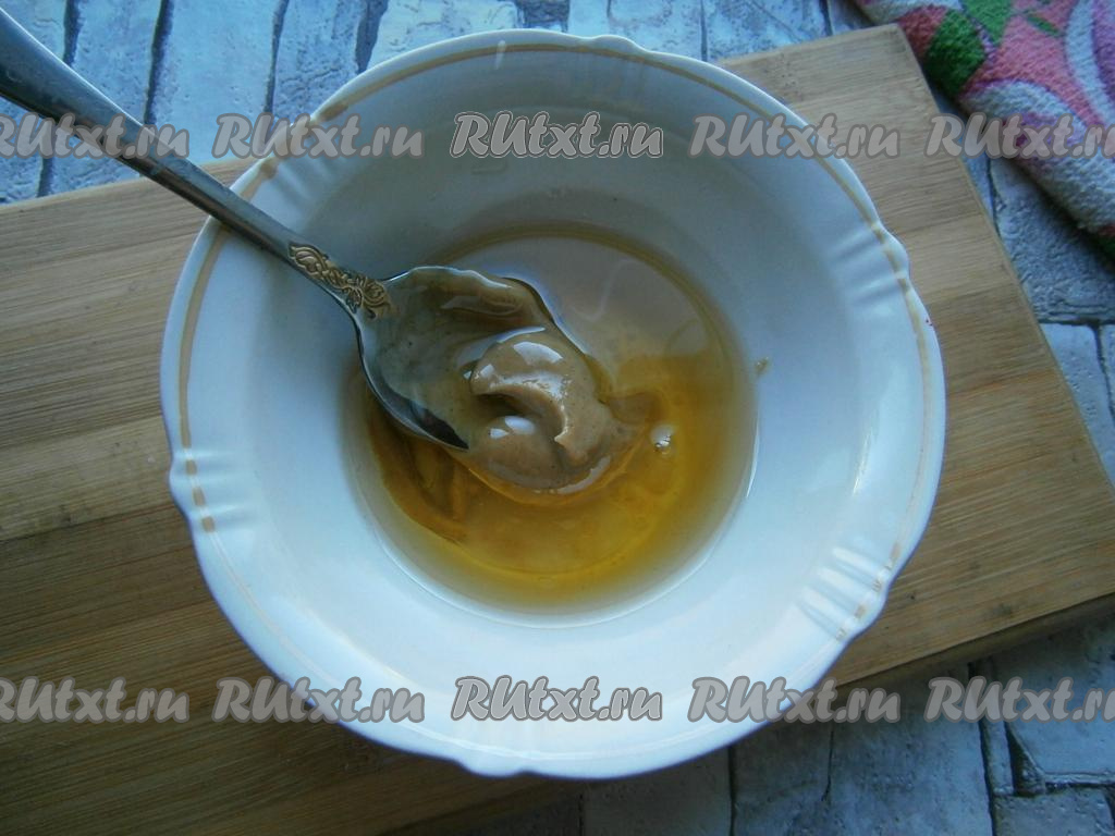 Приготовить заправку: смешать до однородности подсолнечное масло с уксусом и горчицей.