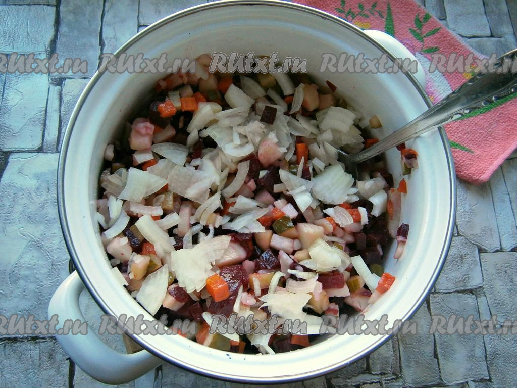 Репчатый лук очистить и нарезать тонкими четвертинами или полукольцами, добавить в винегрет.