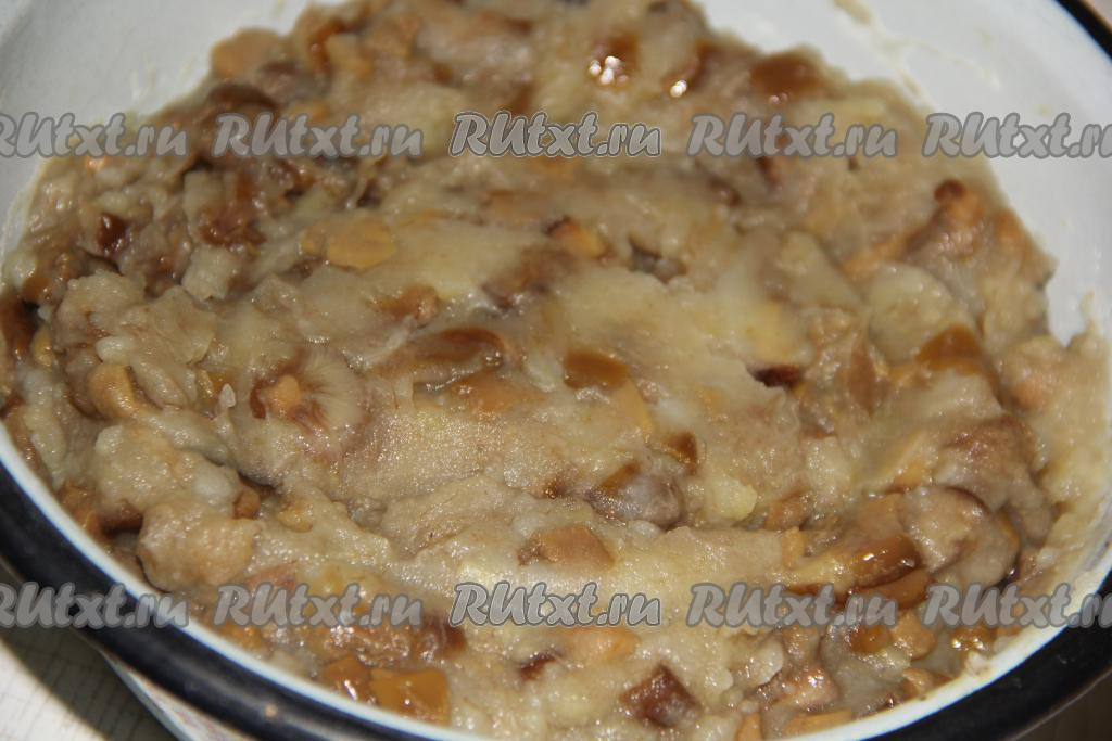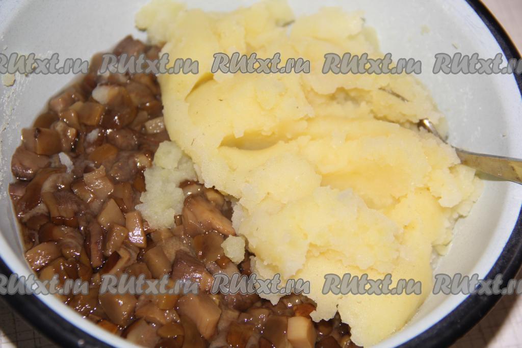 Соединить картофельное пюре с грибами. Можно, по желанию, добавить жаренный лук. Посолить начинку по вкусу.