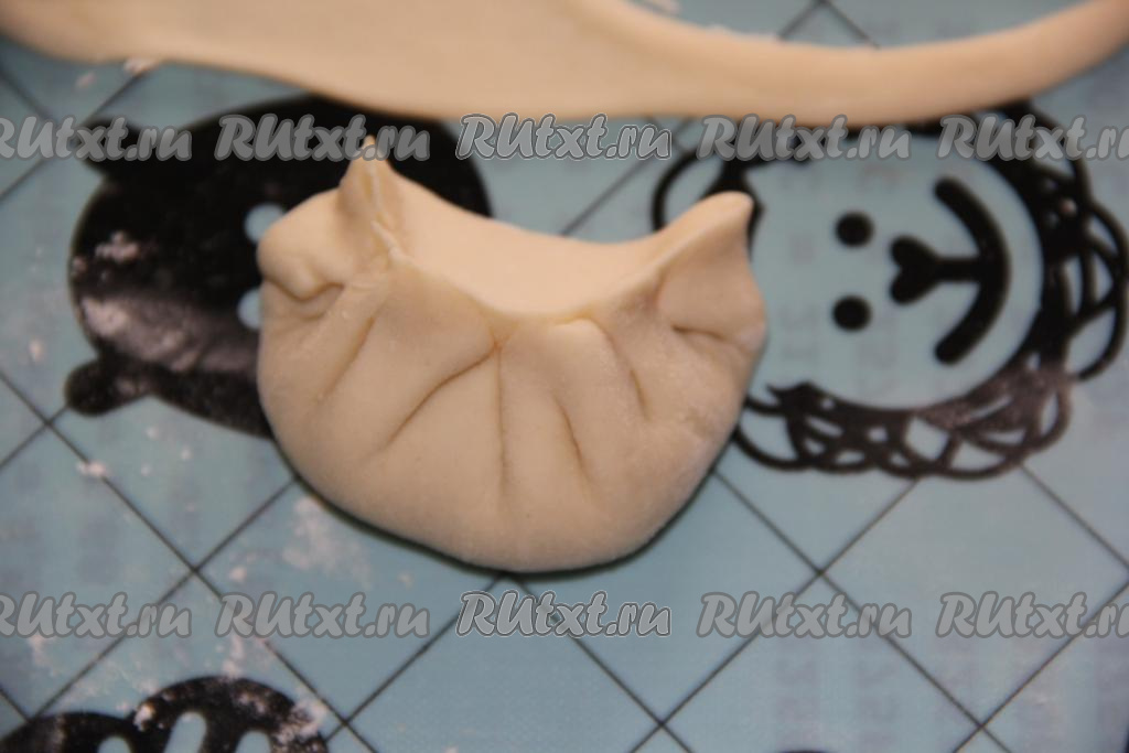 Завернуть начинку в тесто любым способом, хорошо скрепляя края теста.