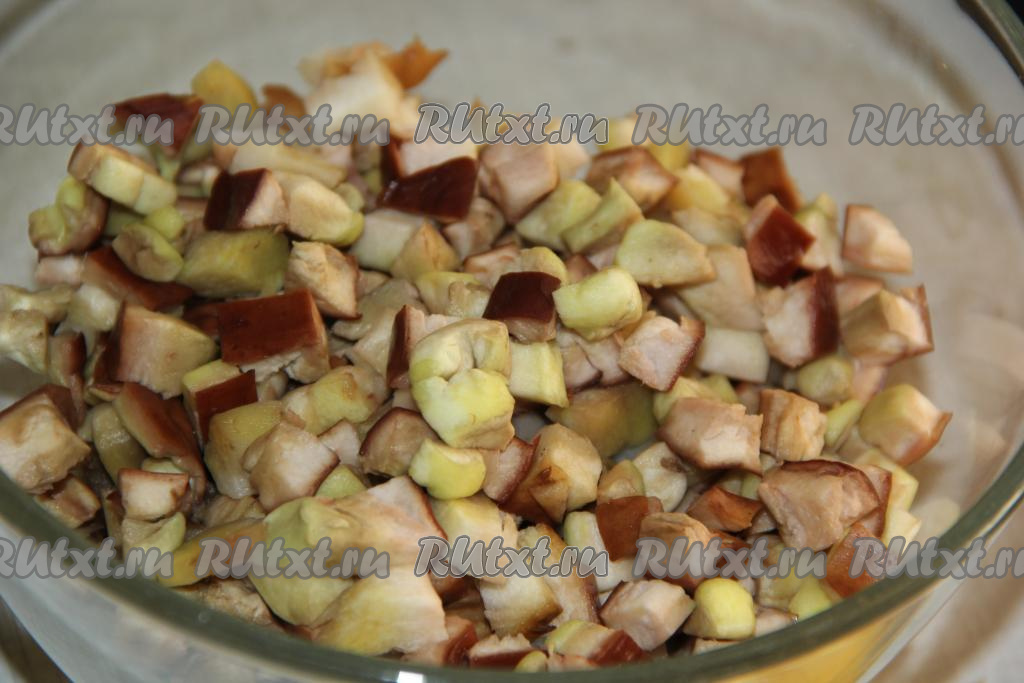 Лесные грибы перебрать, очистить от листьев и мусора, мелко нарезать.