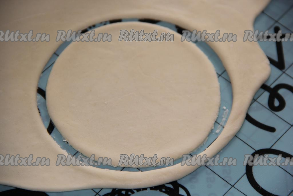 На столе, припыленном мукой, раскатать тесто (слишком тонко раскатывать не нужно, но раскатанный пласт теста не должен быть и толстым), с помощью большой кружки вырезать кружочки.