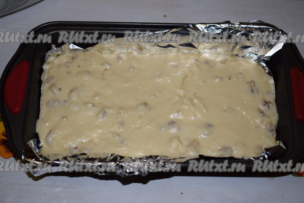 Далее застилаем форму для кекса фольгой (или пергаментом) и выливаем в нее тесто. Отправляем форму с тестом в разогретую духовку и выпекаем 40-45 минут при температуре 180 градусов (ориентируйтесь по своей духовке).
