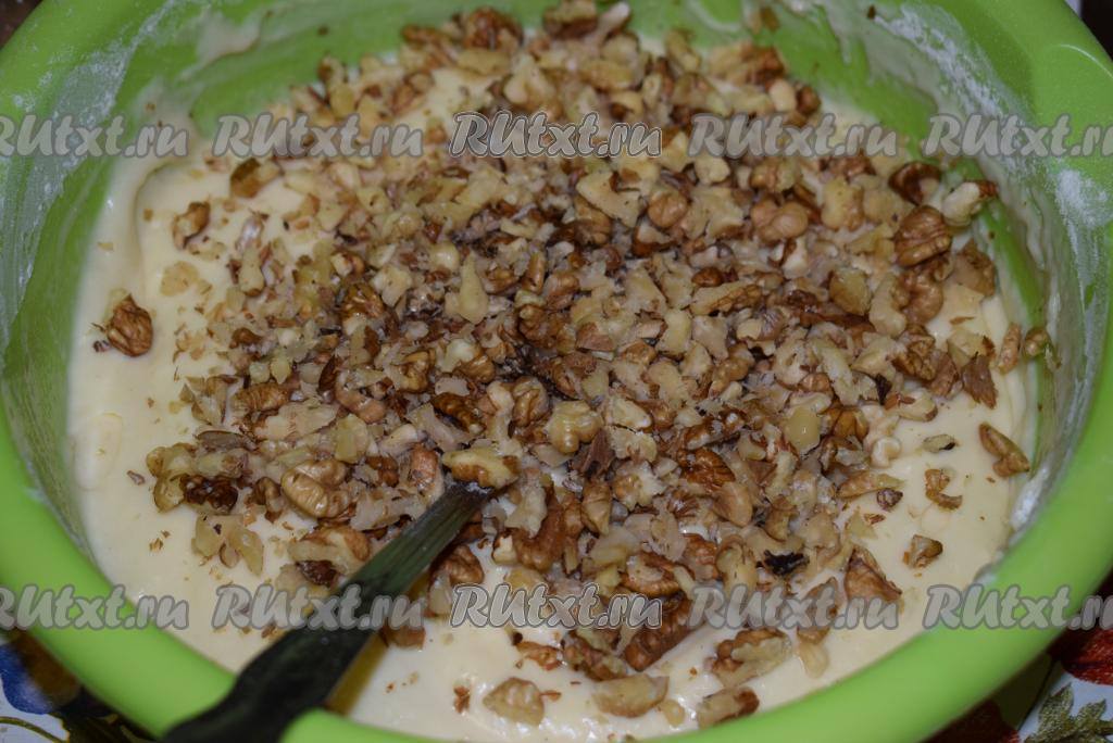 Добавляем в тесто измельченные грецкие орехи. Орехи можно предварительно подсушить на сковороде, но мы предпочитаем вкус сырого ореха в выпечке, поэтому здесь опирайтесь на ваши предпочтения. Помол орехов также выбирайте по своему усмотрению. Мы любим в выпечке орехи среднего размера - они приятно чувствуются в кексе и делают его вкус более интересным.