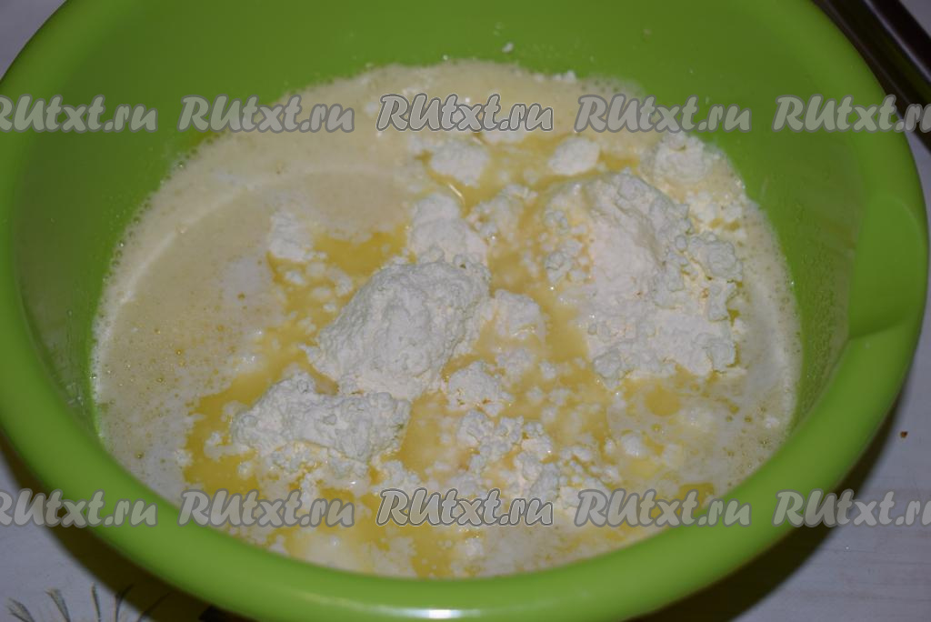 В миску с яйцами, сахаром и маслом добавим творог.