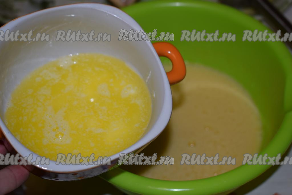 За это время масло размягчится и растопится. Дадим маслу немного остыть и отправим его в миску к яйцам и сахару.